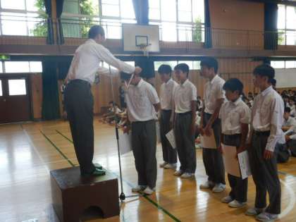 今朝の全校集会は、校長先生から昨日地球に帰還した金井宇宙飛行士についての話がありました。そのあと、昨日の大阪市春季総体で団体準優勝した男子テニス部の表彰がありました。