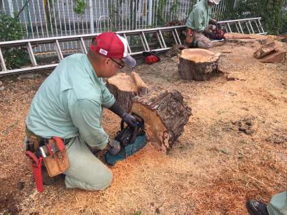 大きな木がみるみる伐採されて、チェーンソーで
