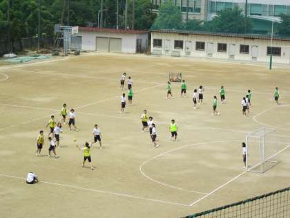 中央の写真は、2年の女子体育。ハンドボールの授業です。広いグランドに2面のコートをとり、今日はゲーム形式。校長室まで声が届きます。そして右の写真は1年の理科。教室に試験管を持ち込んでの視覚にうったえる授業です。