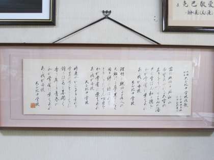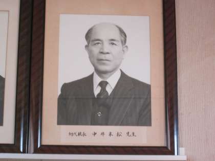 下の写真は、校長室に飾られている「校歌」と中井先生のお写真です。