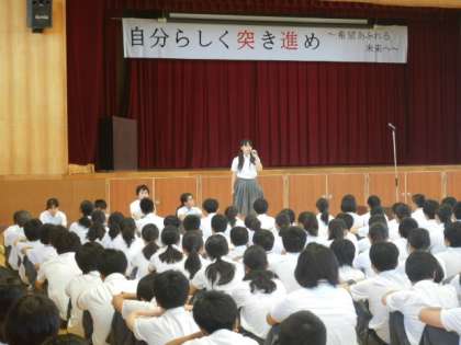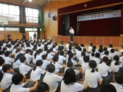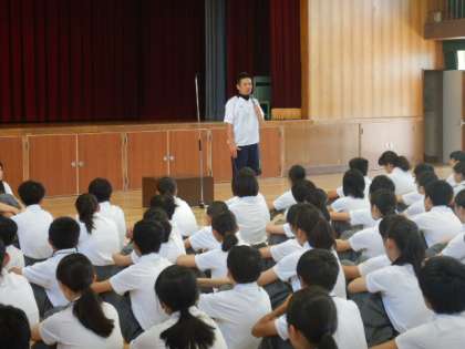 今朝は全校集会がありました。校長先生からは、今回の大豪雨についての話、生徒会からは今週の予定連絡がありました。最後に生活指導担当の先生から、熱中症についての注意、生活の中での危機管理、交通安全について話がありました。