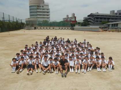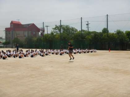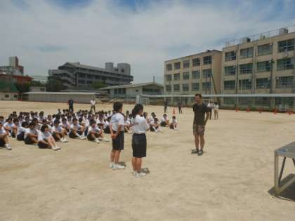 見本として見せていただく荒川さんの足のばねのすごさにとても驚かされました。暑い中での実技でしたが、1時間があっという間に過ぎ去り、最後は生徒代表によるお礼の言葉と記念写真撮影を行い、トップアスリート「夢・授業」は終わりました。