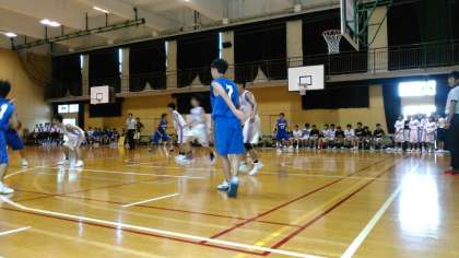 本日、大池中学校体育館で男子バスケ部の府大会が行われています。1回戦の相手は四條畷学園、出だしはリードを奪われましたが、その後は着実に得点を重ね、第2ピリオド終了時は32対19でリードしています。