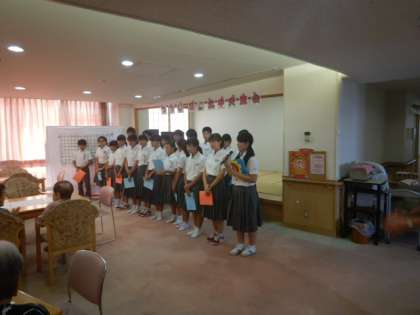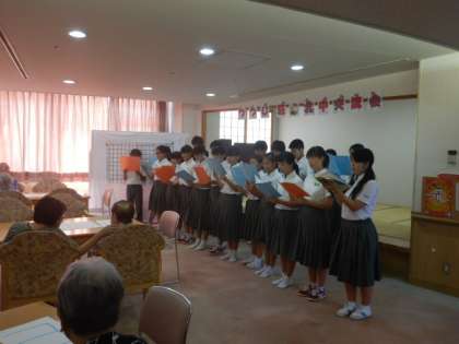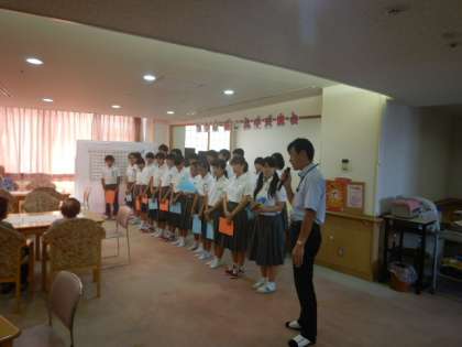 つつじ荘の職員の方に紹介していただいた後、生徒会に進行をまかせていただき、オープニングとして生徒からつつじ荘の皆さんに歌をプレゼントしました。