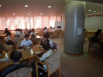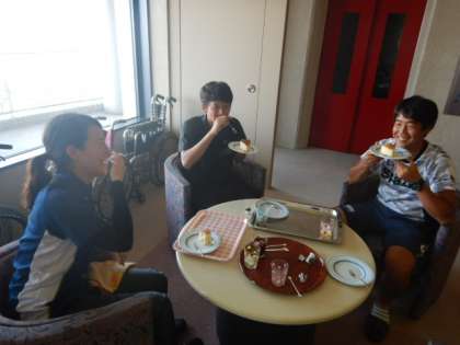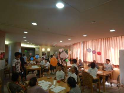クイズのあとは風船バレーで楽しみました。体を動かしたあとはおやつタイムです。つつじ荘で用意していただいたケーキとジュースに生徒もニッコリ、お年寄りのみなさんとの会話もはずみます。引率した生徒会担当の先生たちもケーキをいただいて満面の笑顔です。最後はみんなで記念写真を撮り、交流会は終了しました。本日はありがとうございました。また冬におじゃまします。