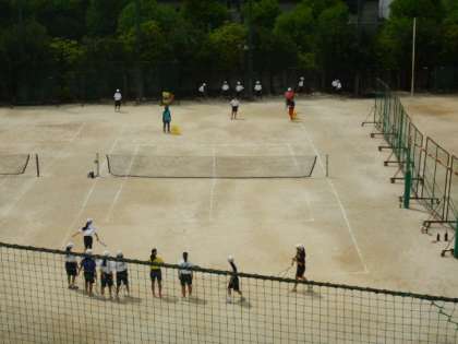 送り盆の今日16日、学校では公式戦を前にした部活が練習に励んでいます。グランドテニスコートでは25、26日にブロック大会を控え、ソフトテニス部ががんばって練習しています。