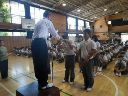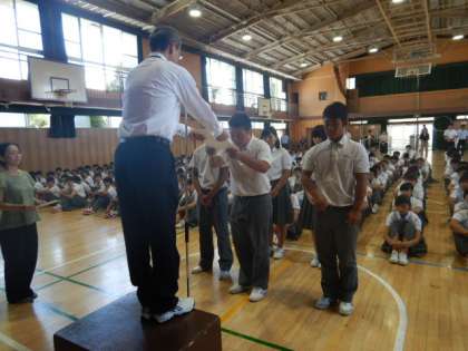 夏休み中の大会などで表彰を受けた部活や生徒への表彰伝達がありました。