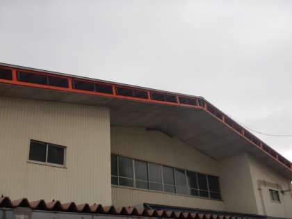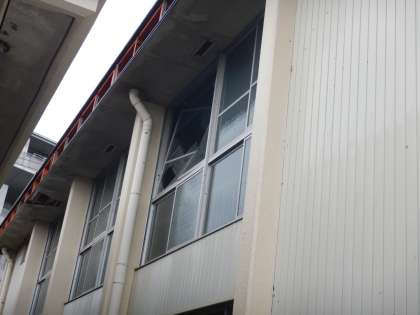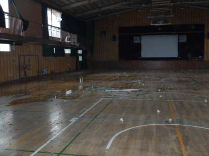体育館が最もひどく、窓ガラスがサッシごと内部に吹き飛び、屋根の側壁も飛ばされて鉄骨が見えています。