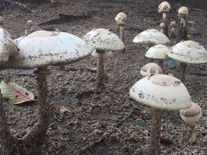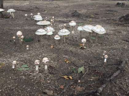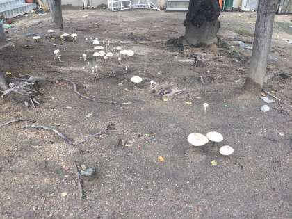 今朝、玄関の桜の木のあたりにたくさんのキノコが出ていました。おそらくオオシロカラカサタケだと思われます。もちろん毒性のあるキノコなので食べられません。