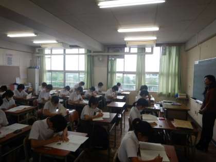 1,2年の範囲が中心のテストなので、これまでの学習の定着が問われます。3年生たちは朝から5時間、一生懸命にテストに取り組んでいます。また今日は1,2年生の宿題テストも同時に実施しています。