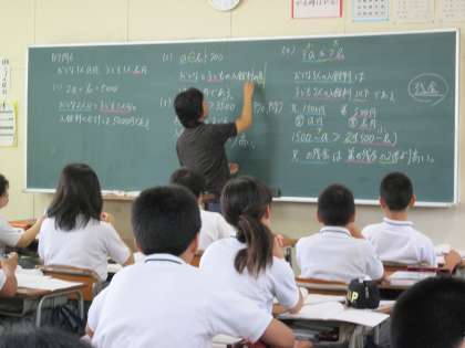 まずは1年生の数学。今日は計算問題ではなく、その応用問題。黒板には、式でなく、文章が書いてありました。さて、式に直して解けるか?