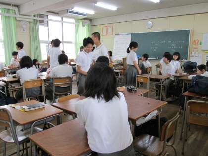 3年生は社会の時間。公民授業の導入で、言語活動も意識しての班学習。午後からの研究授業に備えて、若手教員がリハーサルを行っていました。先生は銀行役。班は国となり、外交官や労働者の役割分担があって面白そう。レートの変化を取り入れた、グローバルな授業でした。