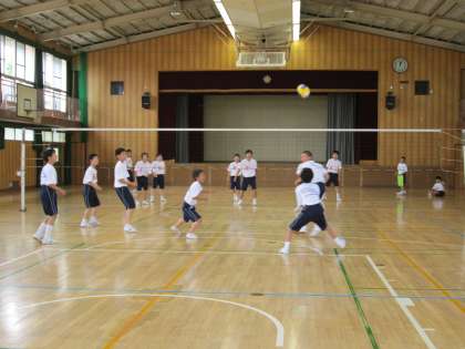 4時間目、1年男子の体育は、体育館でバレーボールの試合。練習の成果で、ラリーが続くようになりました。