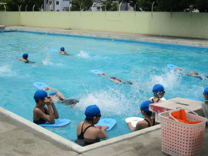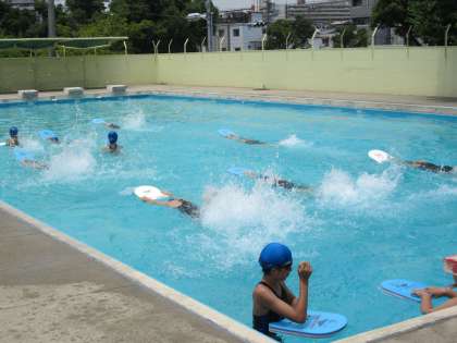 一方、女子は水泳です。太陽に輝くプールで、思う存分に泳いでいます。バタ足の水しぶきが、キラキラ輝いています! とても気持ちよさそうです。