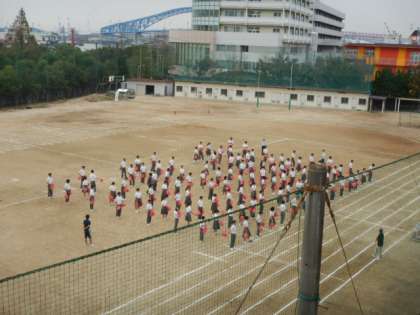 今朝の2年学年集会は、学年全体の練習時間が確保できないこともあり、急きょ場所を運動場に変更して短時間ながらも運動会の学年演技の練習をしました。