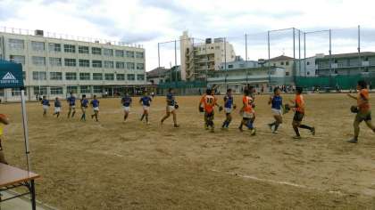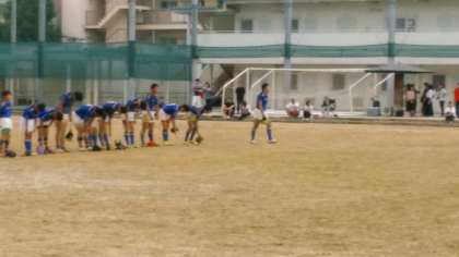 ノーサイドのホイッスルが鳴り試合終了。相手に1つのトライも許さず、大差で圧勝でした。おめでとう。気をゆるめず2回戦も頑張ってください。