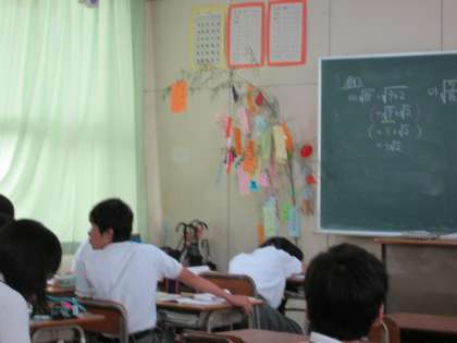 七夕の今日、3年の教室に短冊をたくさんつけた笹の枝が飾られました。