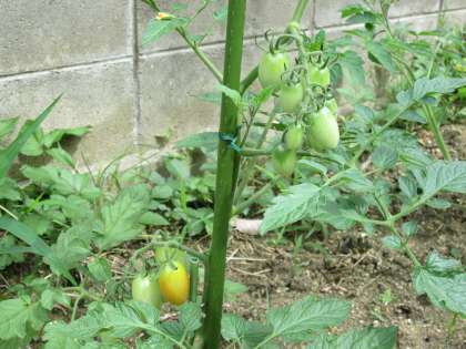 プチトマトに普通のトマト。もっともっと大きくなって、緑から赤に変身するのが、今から楽しみです。