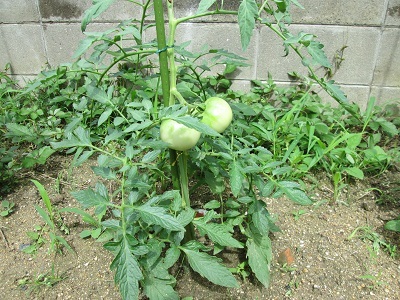 プール横の小さな畑。トマトが実り、次第に色づき始めました。