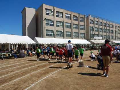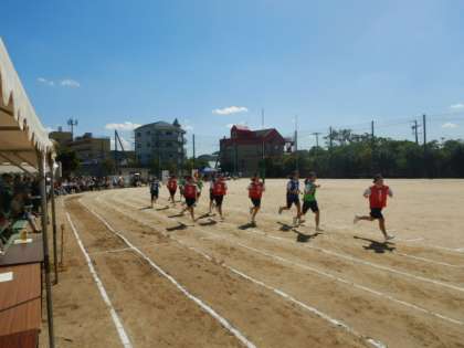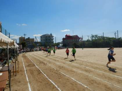 女子800m走です。3学年が一斉にスタートします。800mともなると差が開いてきます。