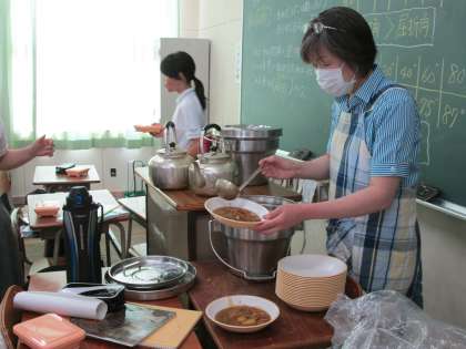 そして1年教室では、担任の先生、副担任の先生がカレーをよそいます。これも時間がかかって大変です。具をうまく分けてあげるのも気を使います。