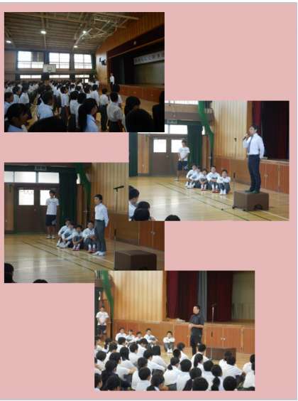 本日は生徒会役員が新しくなって最初の全校集会です。新会長の元気なあいさつに続き、全校生徒も「おはようございます」の元気な声が体育館に響き渡りました。今日は教頭先生から先生たちの研修会についてのお話がありました。生徒会長からは今週の予定、生徒指導主事の先生からは「食」についてのお話がありました。