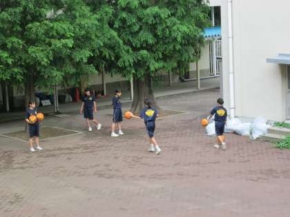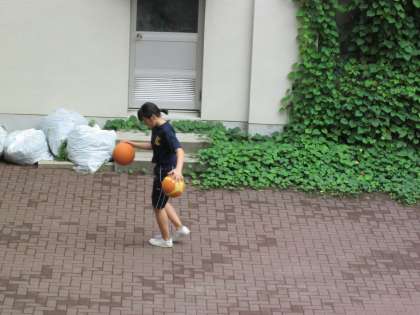 雨上がりの中庭。女子バスケットボール部の声が響きます。