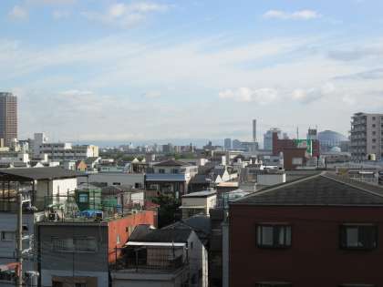 東の空を見ると、生駒連山が姿を現し、大阪ドームも太陽の光で輝いています。