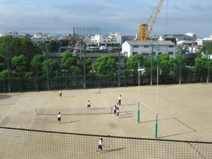 そして、水の引いたグラウンドでは、ソフトテニス部が朝練習で頑張っています。