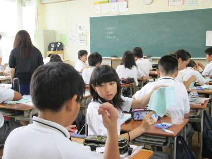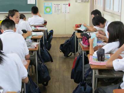 本来は被服室での実習ですが、エアコンがないため、1年生の授業は教室で。