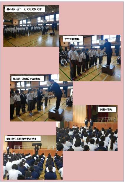 生徒会長からは今週の予定についての連絡があり、生徒指導主事の先生からは明日の冬服完全更衣についてお話がありました。