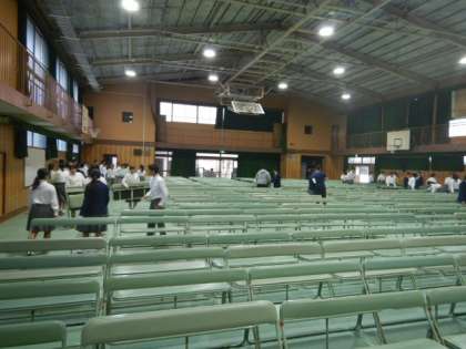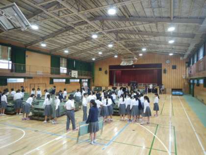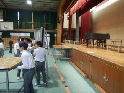 部活動総会終了後、今週木曜日の文化祭を控え、担当の生徒による張り出し舞台の設営が行われました。それに伴い、シートや長椅子の設置も同時に行われました。