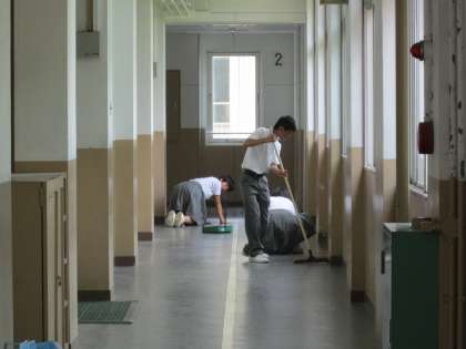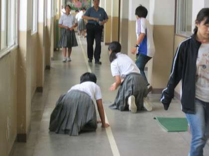 そんな中、目につくのが、廊下の雑巾がけ。腰を落としての大変な作業ですが、女子生徒が頑張って汗を流してくれています。お蔭で校長室前は毎日ピカピカ! 今日も頑張ってくれています。