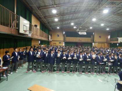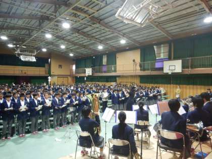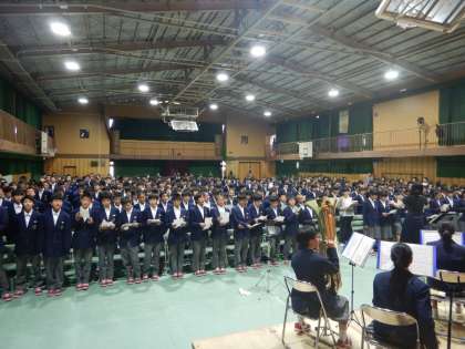 最後に、吹奏楽部の伴奏で全員合唱「花は咲く」です。全校生徒での合唱は圧巻です。
