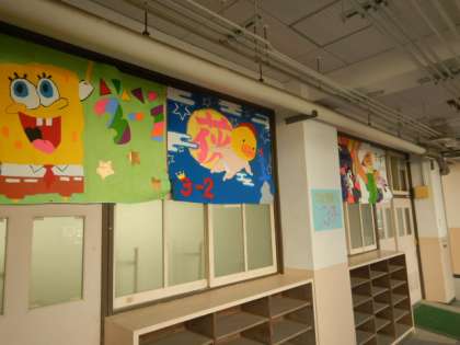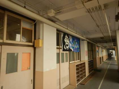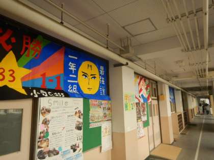 わかば教室前廊下には、体育大会のときに使用した学級旗が展示しています。