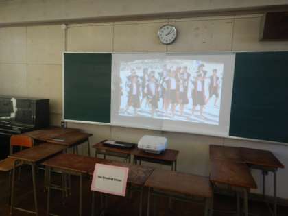 1年学習室では体育大会での学年演技の映像と1年社会科の「興味を持った国の調べ学習」、1年英語科の「似顔絵と英語で書いた自己紹介文」の展示を行っています。