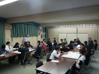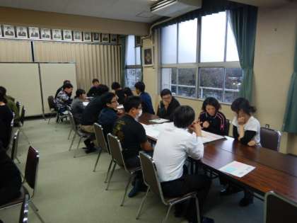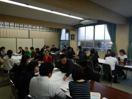 研究授業終了後、多目的室にて各授業ごとに分かれ