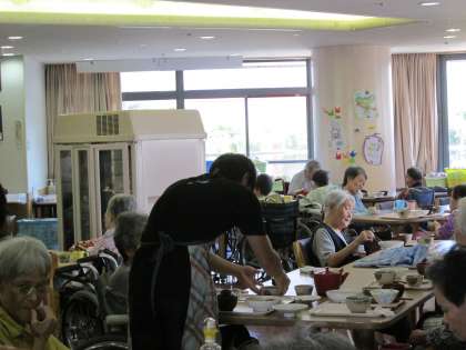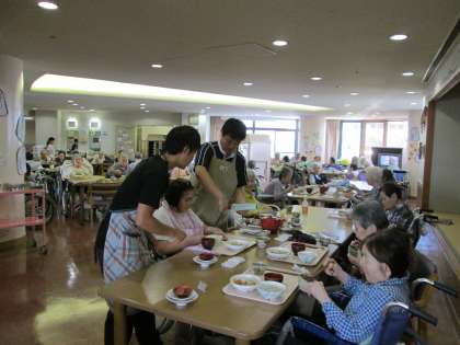 今回は3人の先生が、校区の医療福祉センターでお世話になります。施設にはたくさんのお年寄りがおられ、入浴の補助や食事の介助など、様々な仕事でセンターの皆様にご指導いただきます。