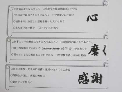 吹奏楽部のスローガンは「心」・「磨く」、そして「感謝」の3つです。