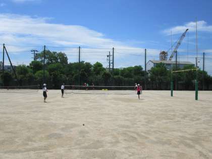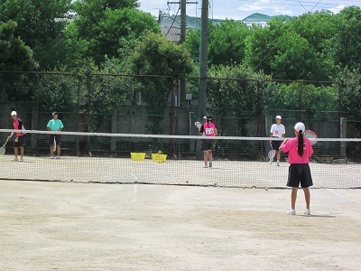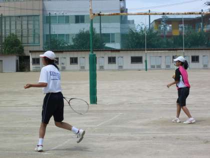 ソフトテニス部は、テニスコートを有効に活用するため、大勢を分割して、時間制で取り組んでいます。