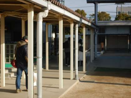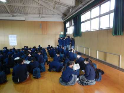 格技室で諸注意が終わり、班ごとに出発待ちです。
