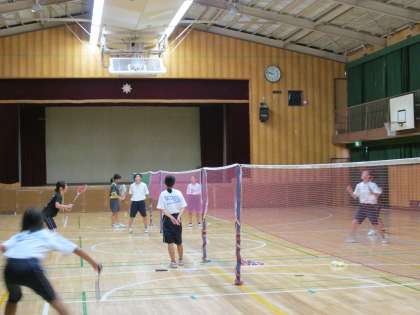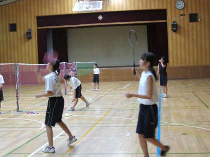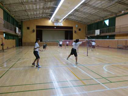 女子のバドミントンの練習。この暑さの中、窓と暗幕を閉めての練習です。