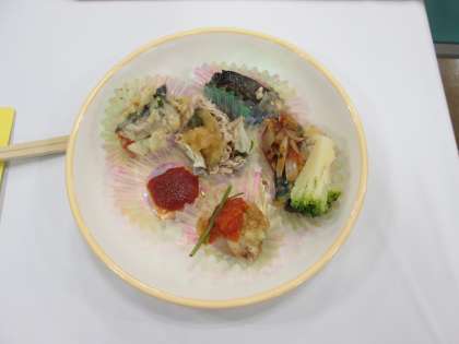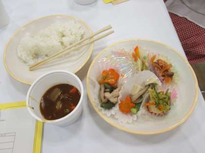 今回の新メニューは国立循環器病研究センターの料理長が開発したもので、「かるしおレシピ」と呼ばれる12品。「ハンバーグ きのこソース」や「七福彩り八宝菜」、「豚肉しゃぶしゃぶ おろしポン酢」などでした。