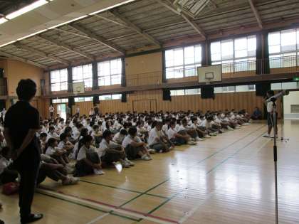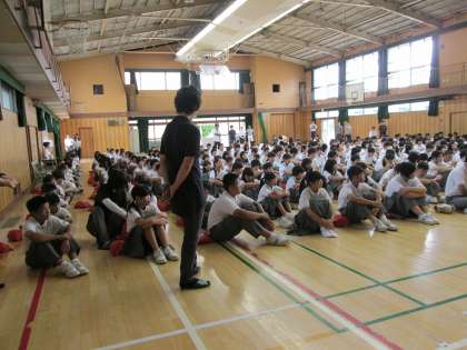 今日は曇り空で猛暑とは言えませんが、久しぶりに体育館に生徒全員が集まると熱気ムンムン。