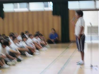 体育館の全校集会で、教務主任の司会のもと、2学期のスタートである始業式が行われました。