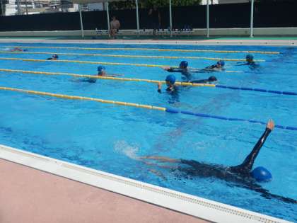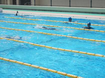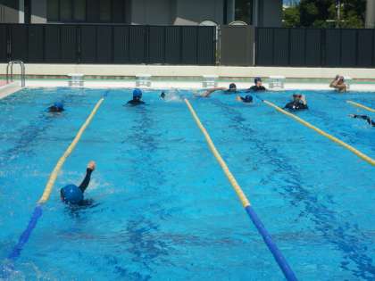 男子バスケットボール部がプールで、遠泳を行っていました。
