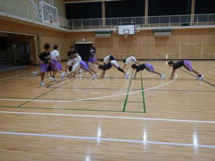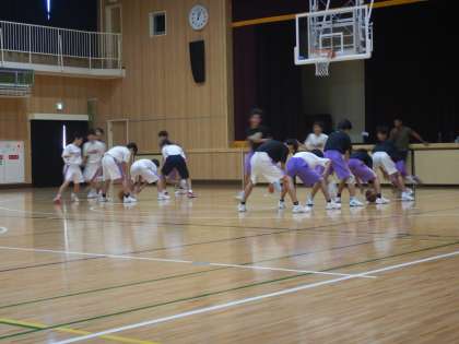 続いて、体で山を作ってその下をボールをワンバウンドで通すリレーをやりました。