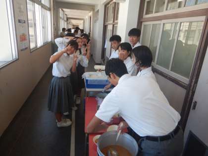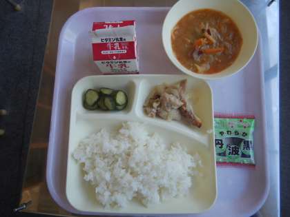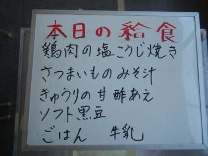 今日の給食は、鶏肉の塩麹焼き、さつまいものみそ汁、きゅうりの甘酢和え、ソフト黒豆です。