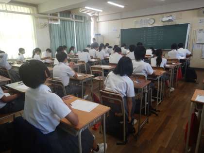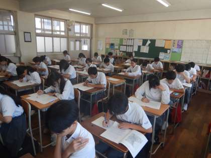 1日で5教科のテストです。1時間目の国語が終わった休み時間に、生徒に声をかけてみると、「できました!!」と、元気な声が返ってきました。どうだろうか、不安です。。。