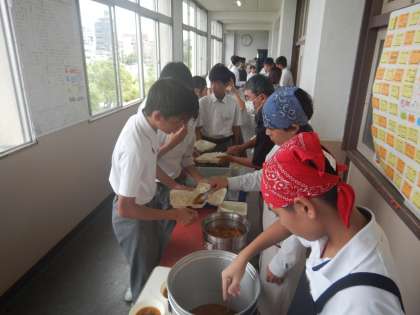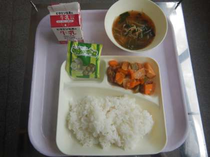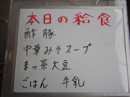 今日の給食は、酢豚、中華味噌スープ、抹茶大豆です。